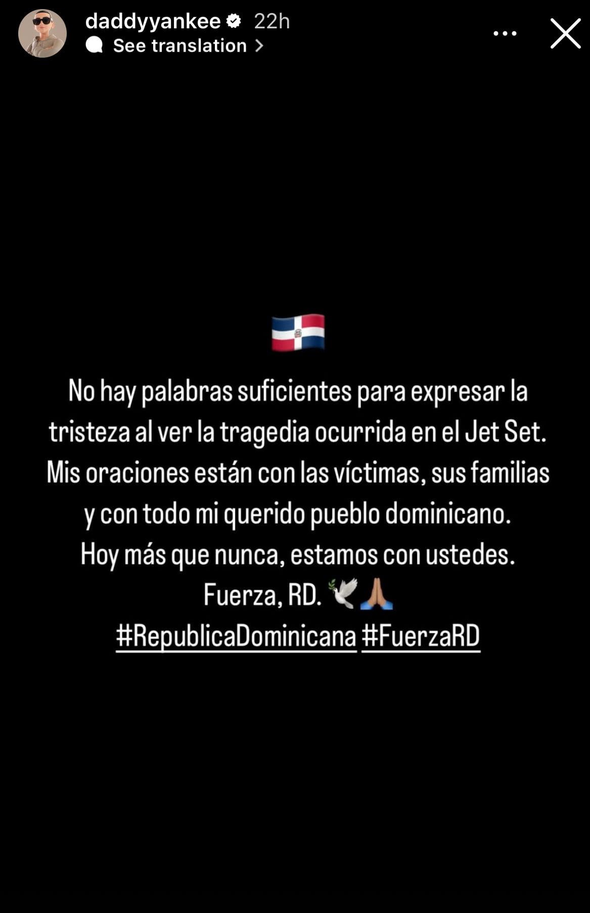 De igual manera, Daddy Yankee expresó su solidaridad en Instagram: “No hay palabras suficientes para expresar la tristeza al ver la tragedia ocurrida en el Jet Set. Mis oraciones están con las víctimas, sus familias y con todo mi querido pueblo dominicano. Hoy más que nunca, estamos con ustedes. Fuerza, RD”.
