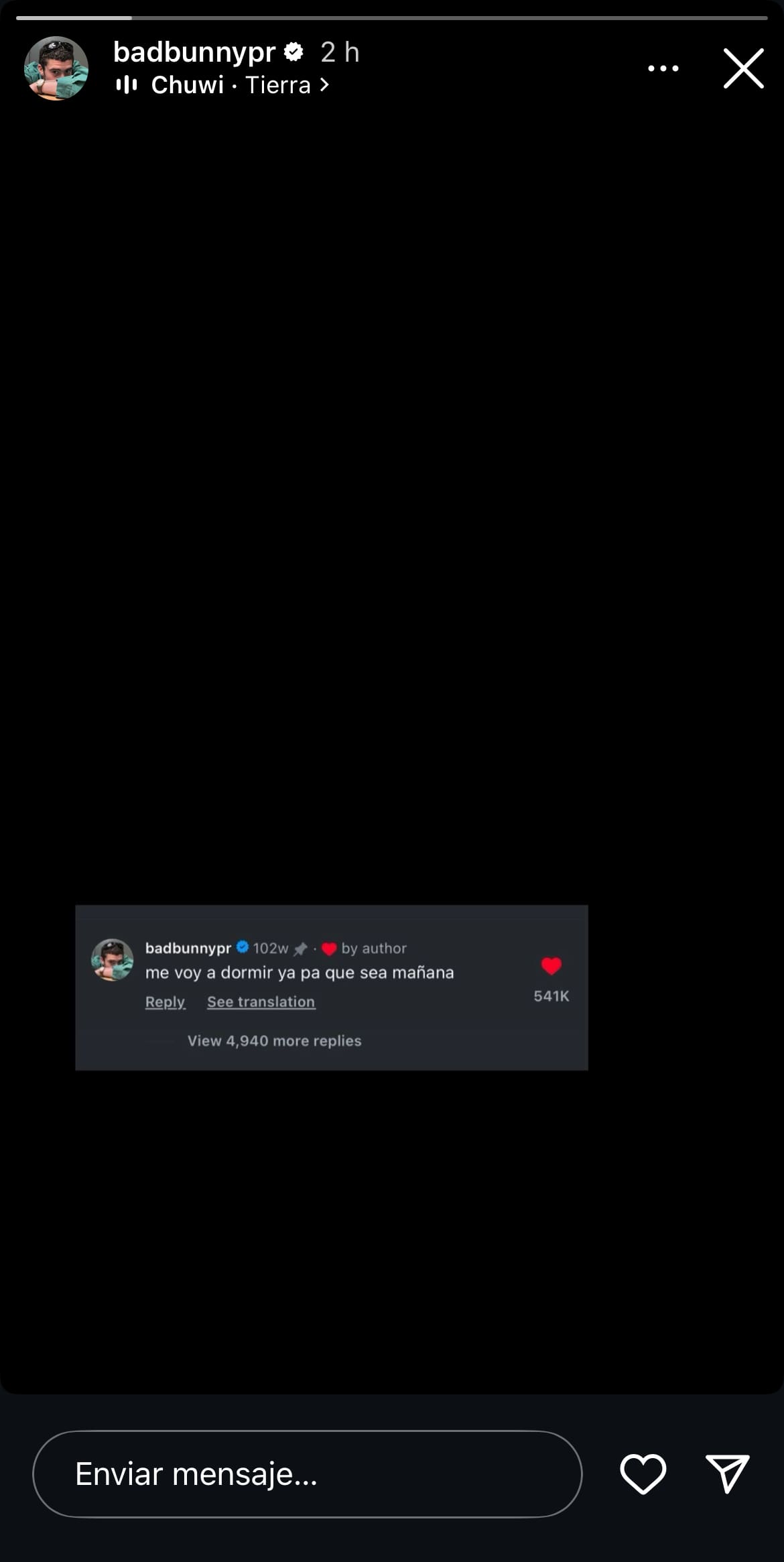 El exponente urbano Benito Antonio Martínez Ocasio, más conocido como Bad Bunny, publicó una captura de pantalla de un mensaje en su historia de Instagram donde expresó: “me voy a dormir ya pa’ que sea mañana”.
