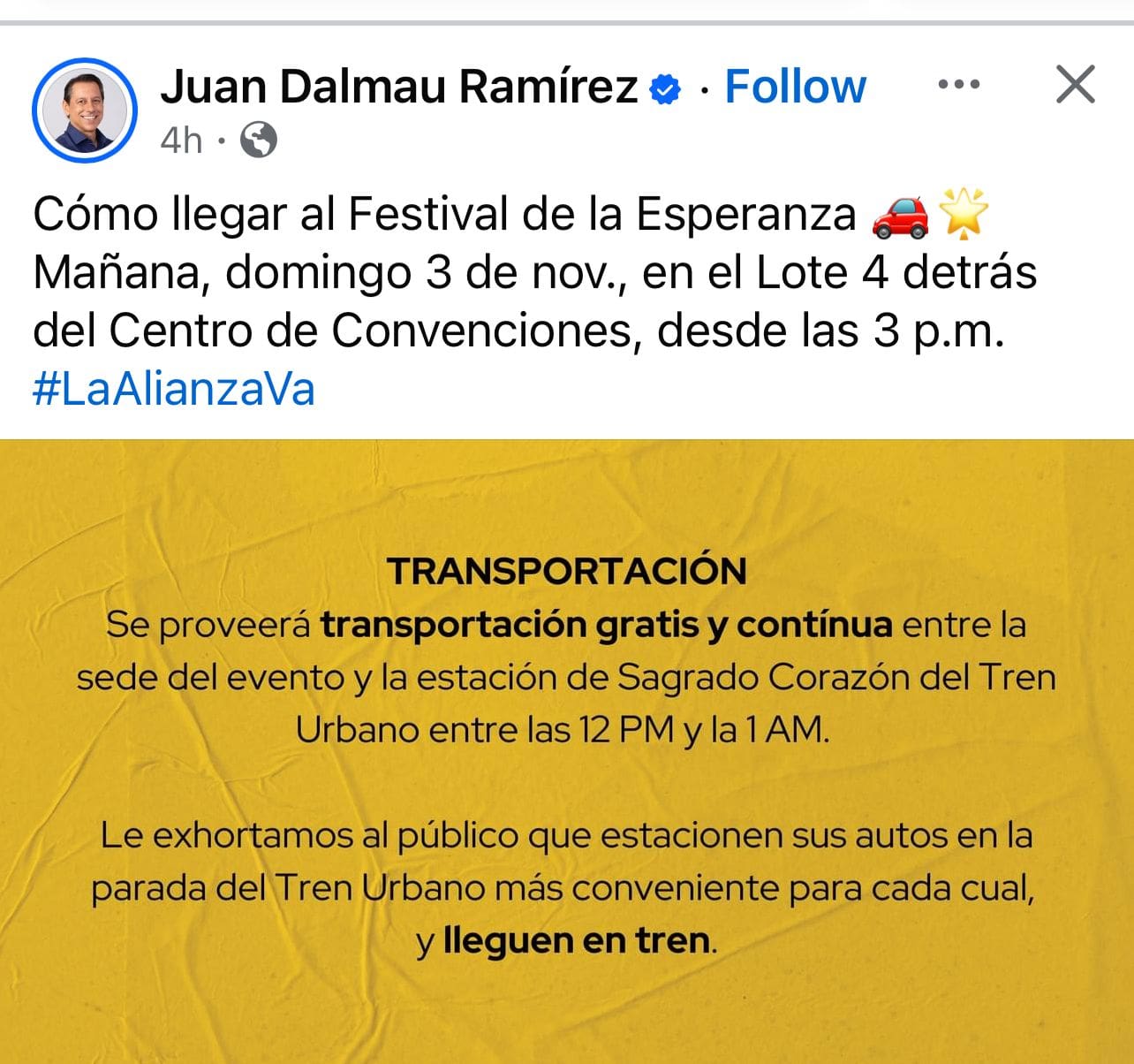 Por otra parte, el candidato a la gobernación por la Alianza, Juan Dalmau, indicó a través de sus redes sociales cómo llegar al cierre de campaña, que empezará en el Lote 4 detrás del Centro de Convenciones, desde las 3 de la tarde.