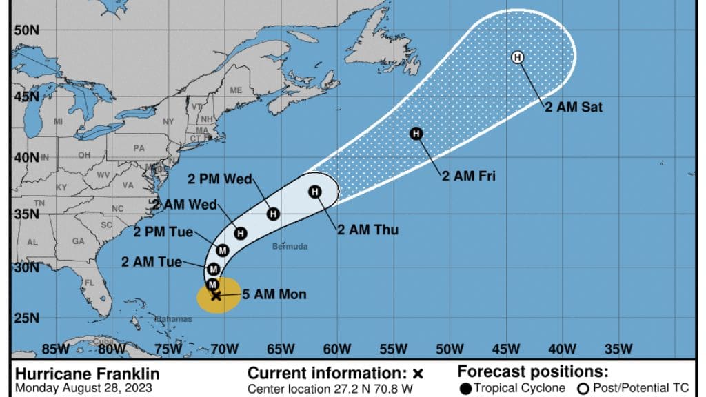 La trayectoria prevista para el huracán Franklin lleva a la tormenta entre la costa este de EE.UU. y las Bermudas antes de girar hacia el este y pasar al norte de las Bermudas.
