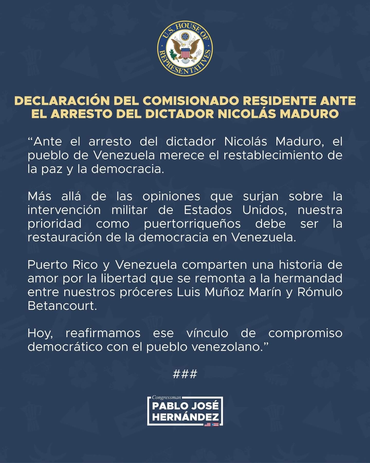 El comisionado residente en Washington, Pablo José Hernández, reaccionó a través de un comunicado al arresto del presidente venezolano Nicolás Maduro y afirmó que “el pueblo de Venezuela merece el restablecimiento de la paz y la democracia”.