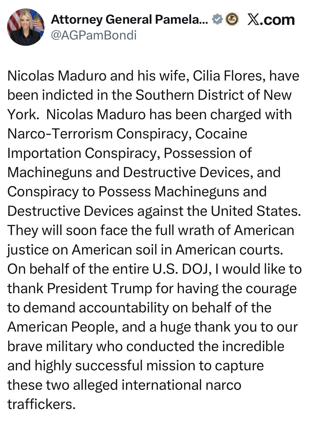 La fiscal general de Estados Unidos, Pam Bondi, afirmó este sábado que el presidente venezolano Nicolás Maduro y su esposa, Cilia Flores, están acusados en territorio estadounidense por presuntos delitos de narcotráfico y terrorismo y que “pronto enfrentarán todo el rigor de la justicia estadounidense” ante tribunales del país.