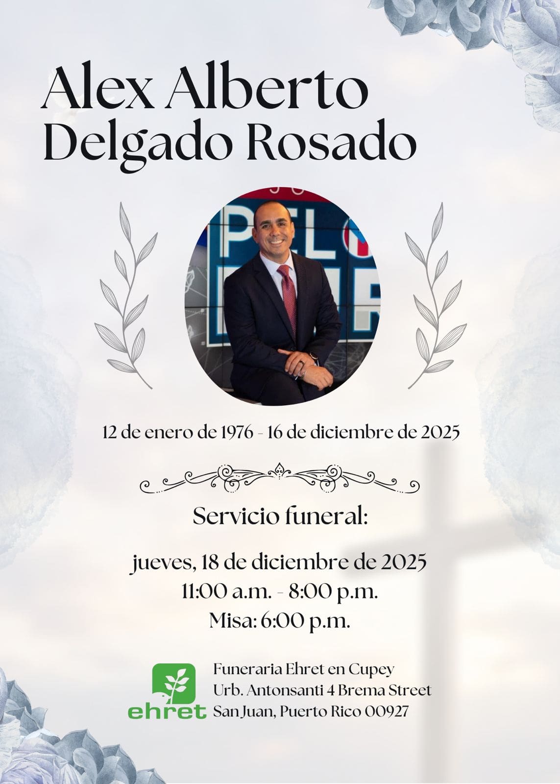 Los actos fúnebres del periodista y comunicador Alex Delgado, quien falleció en la madrugada del martes tras una intensa lucha contra el cáncer, se llevarán a cabo mañana, jueves, en las facilidades de la Funeraria Ehret, en Cupey.