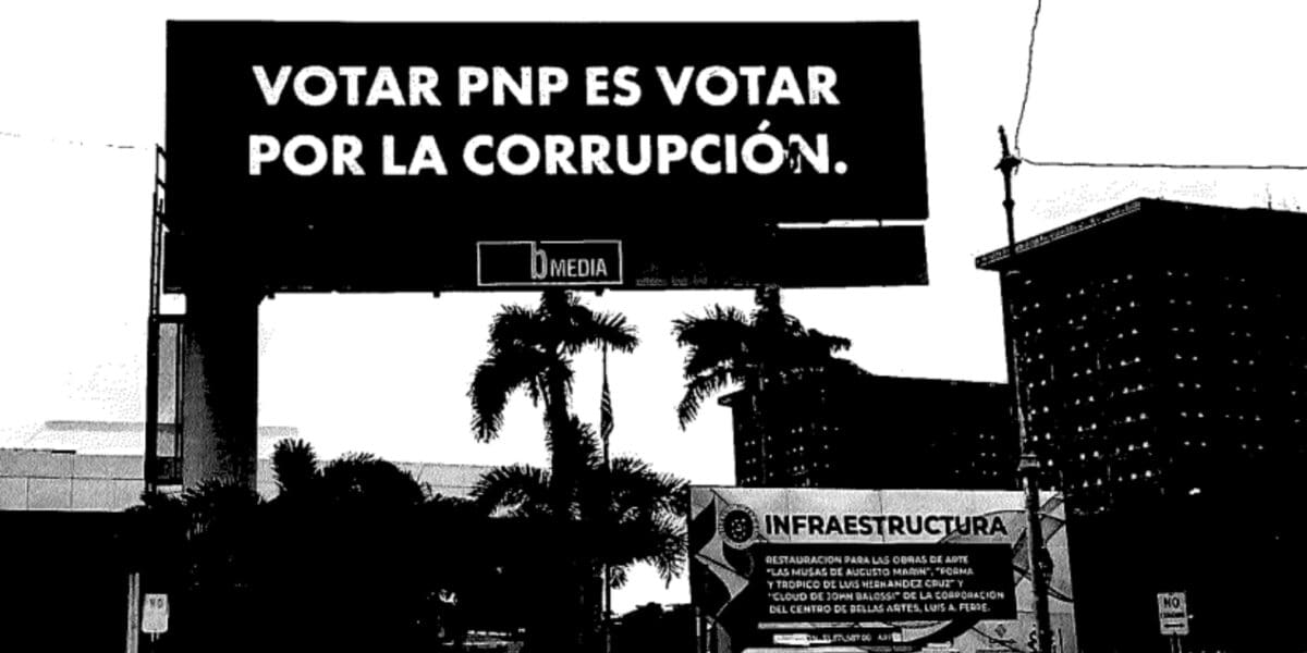 Los anuncios, con fines electorales, muestran un fondo negro con letras blancas que leen como sigue: «QUIEN VOTA PNP NO AMA A PUERTO RICO»; «VOTAR PNP ES VOTAR POR LA CORRUPCIÓN»; «VOTAR PNP ES VOTAR POR LUMA», entre otros.