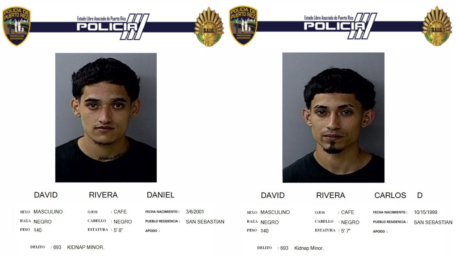 La Fiscalía de Aguadilla radicó cargos contra los hermanos, Carlos David Rivera, alias “El Flaco” de 25 años, y Daniel David Rivera, alias “Bebe” de 23 años, y en ausencia contra su amigo, Rafael Román Valentín, alias “Peka”, por presuntamente secuestrar a un menor de 17 años.