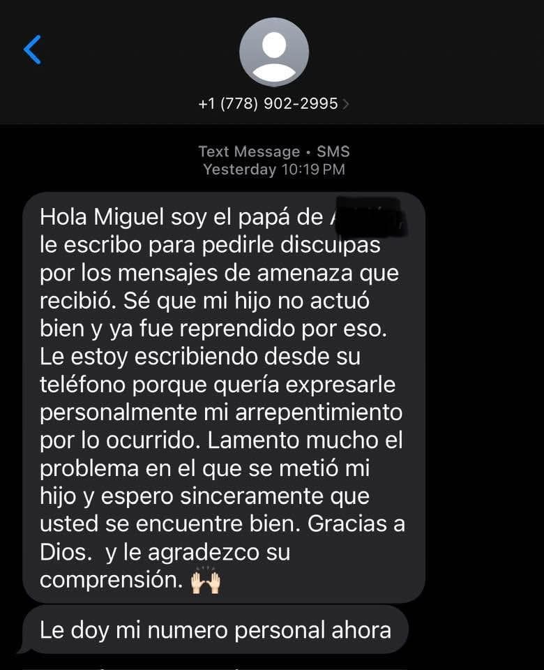 Tras dos mensajes amenazantes, recibió otro mensaje por parte del alegado padre de quien lo amenazó piendo disculpas.